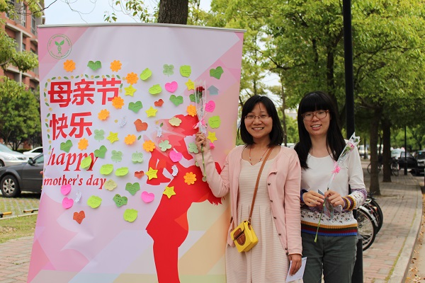 志愿者鼓励同学们在感恩墙上写下对母亲的祝福,并号召同学们在母亲节当天送上“感恩明信片”。同时志愿者还给路过的女教师送上美丽的鲜花,提前向她们送出母亲节的祝福。活动吸引了许多路过的同学加入感恩母爱的行列中。