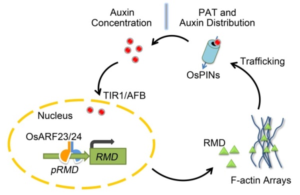 张大兵教授研究团队在已有工作基础上(Zhang et al., 2011, Plant Cell),通过深入研究,发现微丝结合蛋白RMD(Rice Morphology Determinant)是生长素—微丝从细胞核到细胞质反馈调控环通路的重要因子,在生长素信号和微丝成束及排布过程中发挥重要的连接作用。生长素通过生长素应答因子OsARF23和OsARF24直接调节RMD的表达;同时,OsARF23/24-RMD又是生长素自主调控途径中的关键组分,是控制植物细胞微丝排布方向的功能性分子开关,并且这个开关直接影响OsPINs蛋白的运输,生长素的运输分布和生长素介导的植物细胞生长。