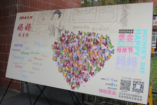 本次活动围绕母亲节在线上线下同时进行。在活动现场,生命科学技术学院党建联合会精心设计了祝福母亲的留言展板,广大师生纷纷参与,将对母亲的祝福和感恩写在蝴蝶便签纸的翅膀上,排成“心形”贴在展板中央。