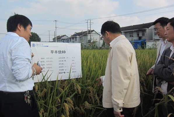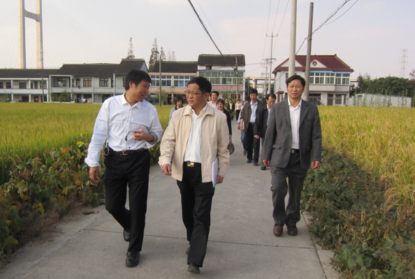 10月23日下午,上海市农委主任孙雷,市农委种植业办公室主任陆峥嵘,闵行区农委主任刘明、副主任张国荣等实地考察了位于浦江镇的上海交通大学水稻分子育种基地。上海交通大学生命科学技术学院张大兵教授向各位领导、专家汇报了其课题组在水稻分子辅助育种方面取得的最新研究成果,并详细介绍了新型大穗型籼粳交超级杂交稻“早丰优69”的实际亩产量、肥料成本及制种等。