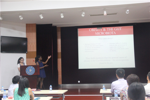会议中,八支团队就近两个月的科研成果依次进行总结汇报,并与参会老师们和同学们进行热烈而深入的探讨。每组团队成员由一名哈佛本科生和一名交大本科生组成,分散在生命科学技术学院六个课题组,共同完成一项科学研究。在汇报结束后,由老师和同学们共同评选出最佳拍档奖(Best Team)、最佳报告奖(Best Presentation)和最佳实验奖(Best Experiment)。来自冯雁教授课题组的Bianca Nfonoyim和秦叶舟凭借实验过程和报告中默契的合作征服了全场,一举赢得最佳拍档奖。来自赵立平教授课题组的Lisa Ma和郝斌翰同学用生动活泼的语言赢得了大家的赞许,拿下最佳报告奖。来自李卫东教授课题组的Garrett Lam荣获最佳实验奖。