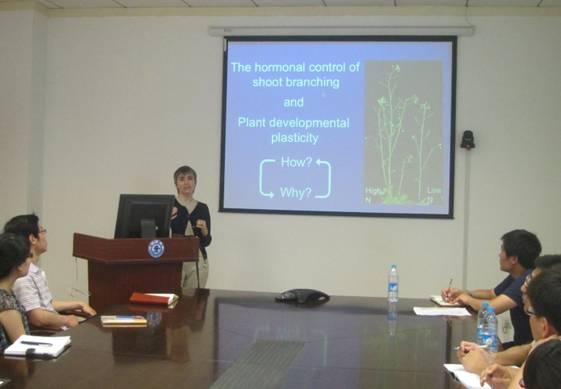 2013年6月15日到18日,英国皇家学会院士、剑桥大学Sainsbury实验室主任Ottoline Leyser教授来到生命科学技术学院进行学术交流访问。访问期间,Ottoline Leyser教授作了题为"The hormonal control of shoot branching and plant developmental plasticity"的精彩学术报告,向大家详细介绍了在其10多年的研究基础上,提出的生长素极性运输主导植物顶端优势的分子机制和模型,并与在座老师和学生就植物激素如细胞分裂素、独角金内酯调控植物顶端优势和植物影响环境进行可塑性展开了热烈的讨论。生命科学技术学院副院长张大兵教授主持了学术研讨会,国际交流合作处副处长郭亮、生命科学技术学院副院长陈峰、杨洪全教授、梁婉琪研究员、吴强教授等参与了学术交流讨论,并探讨了与剑桥大学建立学生交流以及科研合作等。