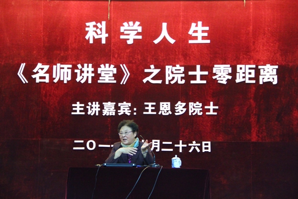 王恩多院士围绕自己的科学道路,从儿时梦想到科学研究,向同学们做了生动具体的讲述。王院士从“什么是科学”进入今天的话题,开始讲述自己如何走上科学研究的道路。首先她讲述了“少年时的梦”,并引用李清照的“生当做人杰,死亦为鬼雄”的诗句,让我们感受到一个科学工作者的壮志雄心。王恩多院士是邹承鲁老先生文革前的最后一个研究生,也是王应睐先生文革后第一位研究生,她从老一辈科学大师的一言一行中感悟到了对科学的更高追求,这也是促使她今后奋发向上的不懈动力。
