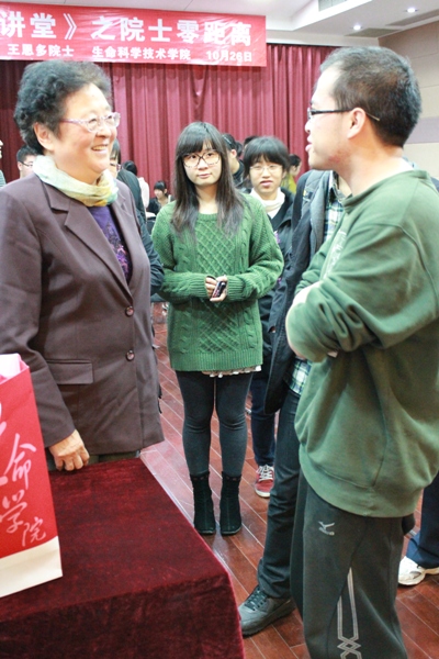 王恩多院士与学生亲切交流演讲结束后王院士又热心的回答了学生的问题。面对学生在科研方面的疑问,王恩多院士用自身研究tRNA合成酶的事例告诉学生,必须开拓自己的知识面,多了解他人的论文,从他人的经验中学习。虽然王院士行程安排十分紧张,但王老仍然一一回答围在身边同学的问题并与学生亲切道别。