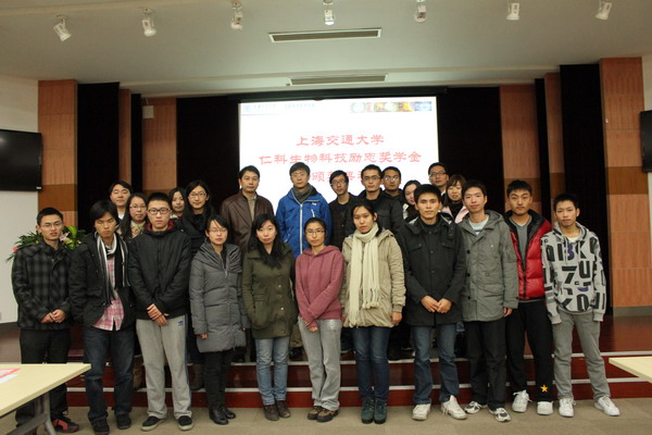 12月19日,上海交通大学2011-2012年度仁科生物科技励志奖学金颁奖典礼在生命科学技术学院树华多能厅隆重举行。本奖学金捐赠人上海仁科生物科技有限公司总经理邱雁南校友、生命科学技术学院常务副院长张雪洪教授、上海仁科生物科技有限公司吴纯威校友应邀出席了本次颁奖典礼,参加本次颁奖典礼的还有本次奖学金获得者以及明年该奖学金申请对象30余名学生,颁奖典礼由生命科学技术学院学生工作负责人李文纯老师主持。