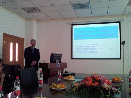 2012年11月12日,美国密歇根州立大学Robert P. Hausinger教授在生物药学楼3-105作了题为“Mechanism and Versatility of Fe(II)/2-Oxoglutarate Hydroxylases”的报告。