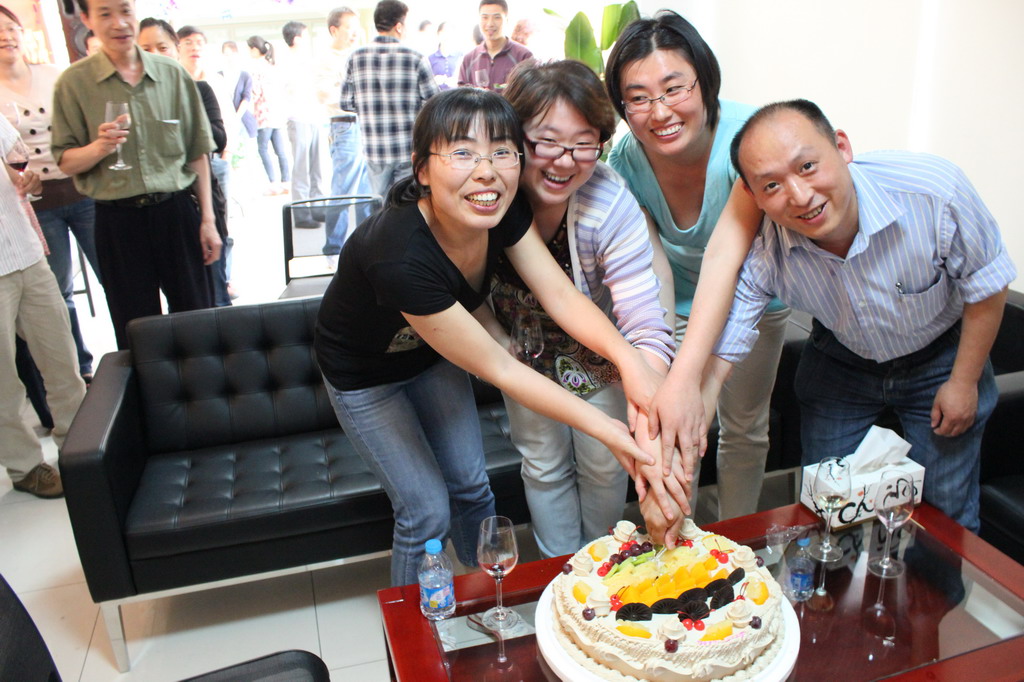 活动的第二个重要环节是为全院五月份生日的老师集体庆祝生日。在一杯杯浓郁的红酒中,在场的所有师生唱起了“祝你生日快乐……”熟悉而温暖的音乐声中,寿星们切开蛋糕,大家举起酒杯,一同为寿星们送出美好的祝福。