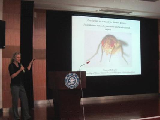 来自中科院上海植物生理生态研究所、上海交通大学生命科学技术学院、农业与生物学院、系统生物医学院和药学院的100多名师生参加了学术报告会议,学术报告由杨洪全教授主持。Anthony R Cashmore教授和Nancy Bonini教授分别为师生作了题为“Cryptochrome: A blue light photoreceptor involved in circadian rhythms in both plants and animals”和“Drosophila as a model for human disease: Insights into neurodegeneration and acute neural injury”的精彩学术报告,并与在座师生就基因功能、进化、实验体系选择等问题进行了热烈地讨论。