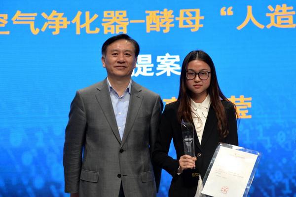 大赛历时8个月,通过海选阶段和可行性论证阶段,由各个专业校内外教授牵头的评审团从3000余项作品中遴选出17项方案获得优胜奖,作为我校师生颠覆性创新性思维的代表进行展示。我院师生积极参与大赛,最终 “空气净化器——酵母人造肺”(闻远、曹莲莹)和“基钥(GeneKey)——未来的通行证”(覃锦程、刘晨光)两项作品获得优胜奖。获奖团队成员为白凤武课题组在读硕士、博士研究生,指导老师为刘晨光副教授。学院党委书记仰颐出席了颁奖典礼并对获奖选手表示了祝贺。