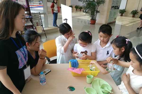 科普专题讲座结束后,观众在志愿者的引导下走进了实验室,亲身感受微生物代谢研究的趣味和魅力。集中展示大厅一如既往,气氛火爆,4个趣味实验展台前都围满了小观众。小朋友们在志愿者耐心到位的指导下,亲自动手进行实验操作,观察实验现象,问题像连珠炮一个接着一个提出来,对生命科学的神秘和奇妙惊叹不已。