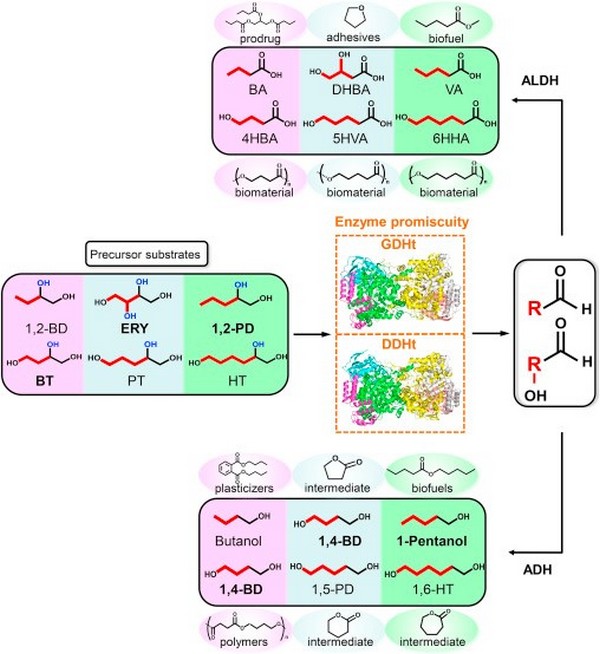 近日,代谢工程领域权威杂志《代谢工程》(Metabolic Engineering)在线发表了上海交通大学生命科学技术学院、微生物代谢国家重点实验室在代谢工程方面的最新进展“Directing enzyme devolution for biosynthesis of alkanols and 1,n-alkanediols from natural polyhydroxy compounds”。《代谢工程》杂志由代谢工程学科创始人之一,美国麻省理工学院教授Gregory Stephanopoulos院士主编,是代谢工程领域内公认的权威专业期刊。本次发表是该杂志本年度对许平教授研究团队系列微生物代谢工程研究工作的第三次报道(另外两次为:Metab. Eng., 2017, 41, 102-114;Metab. Eng., 2017, 39, 90-101),是该研究团队骨干陶飞副研究员等提出并践行“智能代谢重编”理念以来,相关系列研究工作的又一次突破。