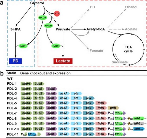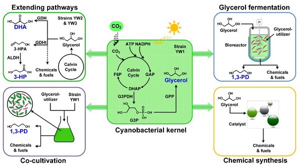 平衡是代谢工程领域的黄金法则,也是“智能代谢重编”思想要遵循的第一原则。在传统利用生物质原料甘油生产聚合物单体的研究中,人们习惯性地专注于目标产物直接相关的甘油还原途径,视其他途径为副反应并加以去除。上海交大的师生们在充分考察和认识甘油代谢特点的基础上,引入并强化了甘油氧化途径,使之与甘油还原途径密切配合,实现了两种聚合物单体化合物的联产和高产(Metab. Eng., 2017, 41, 102-114)。