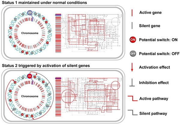“代谢状态开关”是“智能代谢重编”的一种策略,其提出源自于对沉默基因生物学功能的深度理解。沉默基因是生物基因组中蕴含的一类功能尚未被观测到的基因,被视为基因组中的“暗物质”。现代生物学研究暗示这些沉默基因在代谢中可能起到十分重要的功能。上海交大的研究人员在研究中发现,这类基因之所以在进化过程中形成沉默,很可能是由于其活化会对代谢状态产生一种“开关”效应,对细胞的代谢状态产生颠覆性的影响。这种效应如果能够被利用,就可以实现对代谢流的高效的全局的控制,极大地简化代谢工程操作(Metab. Eng., 2017, 39, 90-101)。
