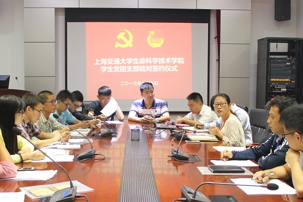 学生团支书代表林海韵宣读《上海交通大学生命科学技术学院学生党团支部结对协议书》。协议中要求党支部与团支部在党团活动中要互相参与,并结合自身特点,组织具有特色的结对特色活动;党支部对团支部活动有指导义务,并应组织对团支部本科生进行学业辅导,在共建活动中吸引优秀团员加入党组织;协议有效期为一年。协议书经鼓掌通过后,二十位支部书记在协议书上签字。