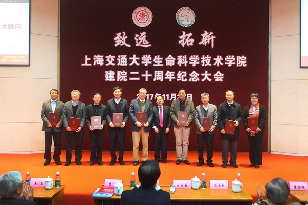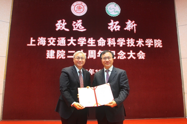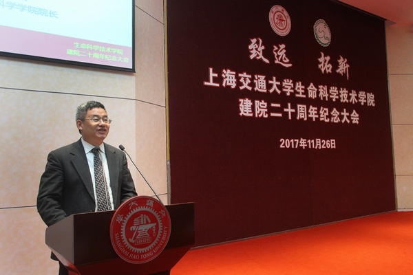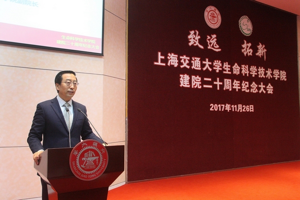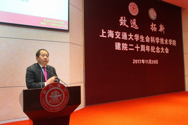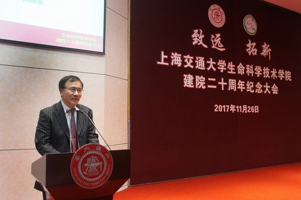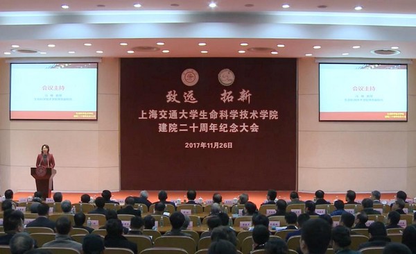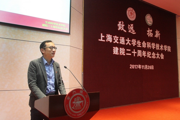 11月26日,上海交通大学生命科学技术学院建院二十周年暨建系三十二年纪念大会在闵行校区举行。上海交通大学校长、党委副书记林忠钦院士,中科院副院长张杰院士,上海交通大学原校长翁史烈院士,同济大学原校长裴钢院士出席大会并讲话。院士杨胜利、陈凯先、张启发、李林、韩斌、林鸿宣、曹晓风,兄弟单位代表中科院上海分院副院长瞿荣辉、高等教育出版社副总编林金安、中科院生物化学与细胞生物学研究所所长刘小龙、天津大学副校长元英进、上海海事大学党委副书记门妍萍、上海交通大学医学院附属国际和平妇幼保健院院长黄荷凤应邀出席。上海交通大学党委常委、副校长吴旦,上海交通大学生命科学技术学院院长邓子新院士、生命科学技术学院党委书记仰颐出席会议。与学院密切合作的企业界代表,部分学校机关部处、兄弟院系领导,学院校友、教师、在读学生等近500人参会。大会由生命科学技术学院常务副院长冯雁主持。