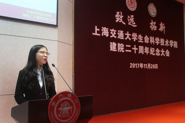 学生代表、2014级本科生林海韵发言。她感言,作为成长在与时俱进、开拓创新的生命科学技术学院的新一代生科人,感到非常幸运和自豪。她代表学院学生向潜心育人的老师们表示诚挚感谢,向学院建院二十周年表达衷心祝福。继承着学院丰厚精神财富的众多学子们将一路前行,为学院的美好未来贡献自己的力量。