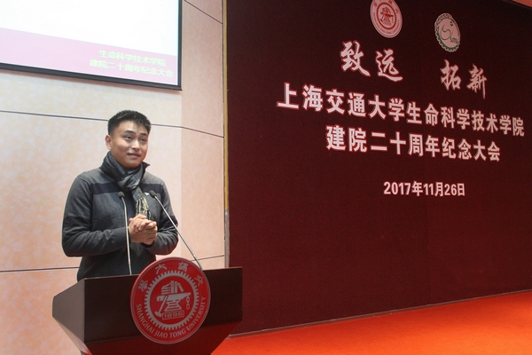 教师代表师咏勇发言。他表示,自己来到交大也恰好二十年,与生命科学结缘于当年的通识课《生命科学导读》。正是一批批优秀教师的引领,激起了他了对生命科学的热情,由此走上了生命科学研究的道路。毕业后,成为学院教师,承担起育人的神圣使命,将继续发扬学院优良传统,培养更多的生科人才,为学院的发展贡献力量。