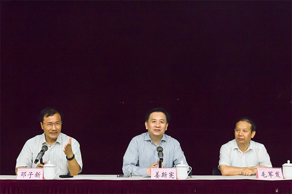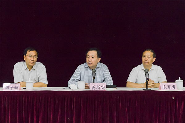 毛军发讲话。他表示,“党政一体”对学院发展至关重要,希望学院能够在党政班子领导下继续保持先进,发挥优势,凸显学科特色,继续创造辉煌。