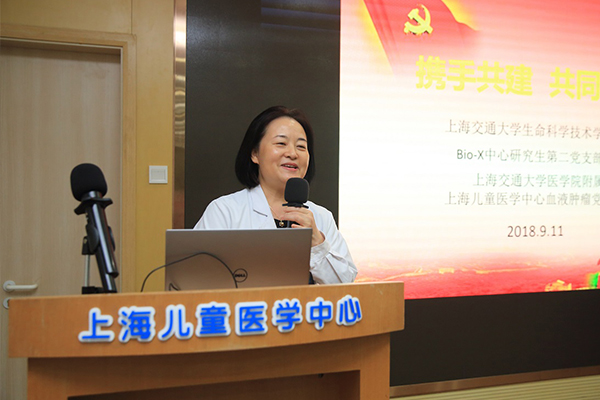 为响应学校号召,深入学习宣传贯彻习近平新时代中国特色社会主义思想和党十九大精神,围绕“立德树人”根本任务和学校“四位一体”育人理念,推动学生价值引领工作落细、落小、落实,引导广大学生党员走进社会、了解国情、增长才干,切实增强学生党支部的创造力、凝聚力、战斗力,2018年9月11日,生命科学技术学院Bio-X中心研究生第二党支部联合上海交通大学医学院附属上海儿童医学中心血液肿瘤党支部在血液肿瘤中心大楼成功举办了党支部结对共建仪式及共建后的第一次以“我与学科共成长”为主题的党日活动。活动得到生命科学技术学院和医学院附属上海儿童医学中心领导的大力支持,上海儿童医学中心副院长兼党委副书记季庆英,生命科学技术学院党委副书记李文纯、学生办主任张燕红出席,双方支部书记及党支部60余名党员共同参加。