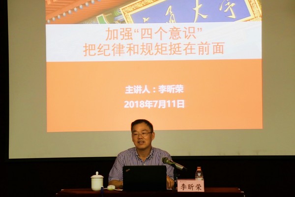 李昕荣以《加强四个意识,把纪律和规矩挺在前面》为题,进行了纪检工作培训。李书记从纪检工作的大背景入手,回顾了纪检监察工作历史沿革及现状,总结了新时代纪检监察工作的特点。通过一个个高等教育领域全面从严治党的案例分析,给大家重温了八项规定的纪律要求,指出了高校党风廉政建设存在的风险领域和易出现的相关问题。他呼吁,教职工党员同志特别是支部委员同志应始终保持党的纯洁性和先进性,全面贯彻新时代全面从严治党的历史使命要求。