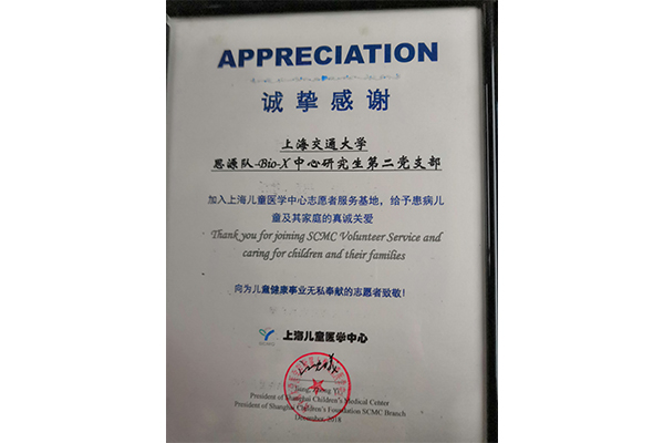 下午,两支部成员代表共聚上海儿童医学中心,在主楼一楼门诊大厅举行启动仪式。儿童中心社工部陈玉婷主任致欢迎辞,向到场的儿童及家长、医务工作人员和志愿者团队表示诚挚感谢,并为志愿者团队颁发证书。研究生党支部代表代雨婷同志上台接受证书,并向大家介绍本次Bio-X中心研究生第二党支部和血液肿瘤党支部共建的活动内容。