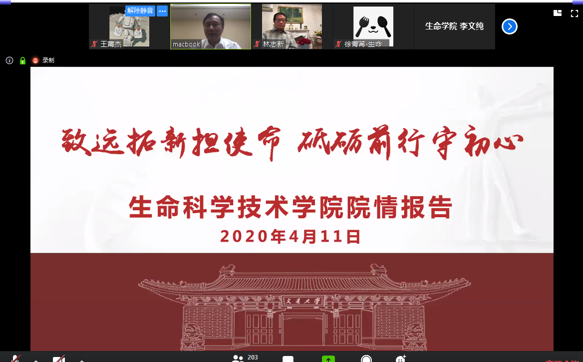 在全球抗“疫”的特殊时期,生命科学技术学院结合学院自身特色,组织开展生科人“云团聚”活动,共庆母校建校124周年华诞。本次活动采用了线上形式,通过Zoom平台云端相会。学院党委书记嵇绍岭,院长邓子新,前院长林志新,常务副院长冯雁,党委副书记李文纯,副院长李志勇、林双君等学院领导以及200余名师生、海内外校友相聚在“云教室”,共叙生科情。活动由李文纯主持。