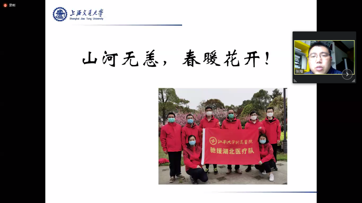 2020年4月11日喜迎交大124周年生日,在校友云端相聚之时,生命科学技术学院特别邀请4位参与抗疫的生科校友带来“战疫-生科人的责任与担当”主题教育活动。张烽、谢青、刘保成和赵百慧四位校友均为中共党员,为学院全体学生党员分享了生科人在这次新冠肺炎疫情中的战疫故事,会议由徐菁苒主持。