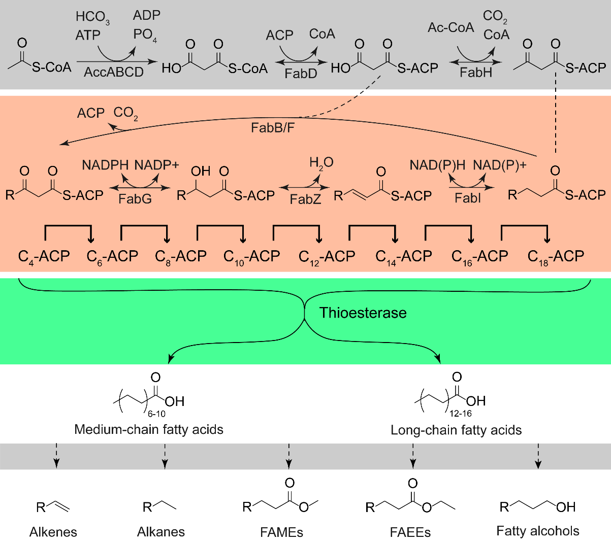 酰基链长为六到十个碳原子的中链脂肪酸(MCFAs, C6–C10)及衍生物具有独特的应用价值。与长链组分相比,中链烷烃/烯烃及脂肪酸酯更适合用来替代汽油等现有化石燃料;中链脂肪酸还具有抗菌、免疫调控等效果,使相关衍生物广泛应用于食品、药物生产中。近年来脂肪酸的微生物合成取得了许多进展,但产物中应用价值更高的中链脂肪酸含量仍然较低。硫酯酶是脂肪酸合成过程中链长控制的关键酶,对硫酯酶进行底物选择性的定向设计是提高中链脂肪酸合成能力的关键。