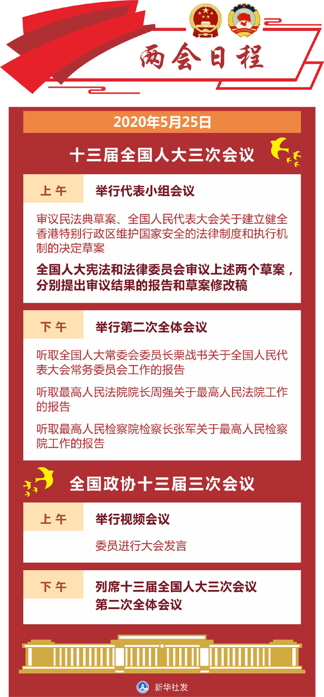 新华社北京5月24日电 25日上午,十三届全国人大三次会议举行代表小组会议,审议民法典草案、全国人民代表大会开元(中国)建立健全香港特别行政区维护国家安全的法律制度和执行机制的决定草案;全国人大宪法和法律委员会审议上述两个草案,分别提出审议结果的报告和草案修改稿。