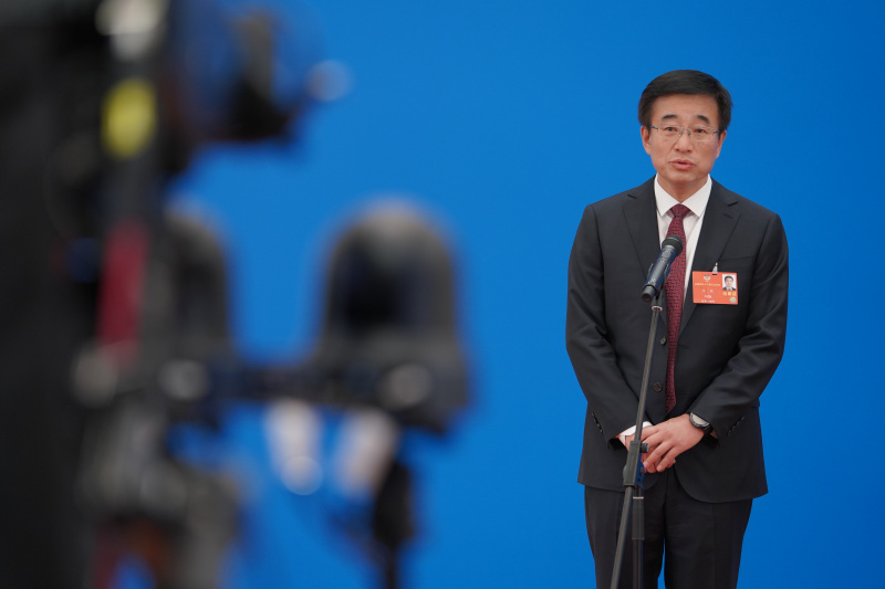 5月21日,在北京人民大会堂新闻发布厅举行的全国政协十三届三次会议第一场“委员通道”采访活动上,全国政协委员王辰通过网络视频方式接受媒体采访。新华社记者 刘金海 摄
