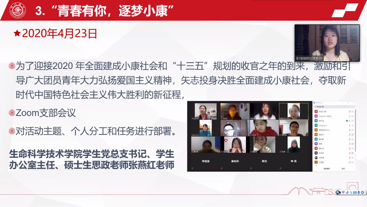 6月3日,生命科学技术学院线上举行2019-2020学年春季学期团日活动总结评审会。会议由辅导员岳鑫主持,各团支部团支书参加会议。