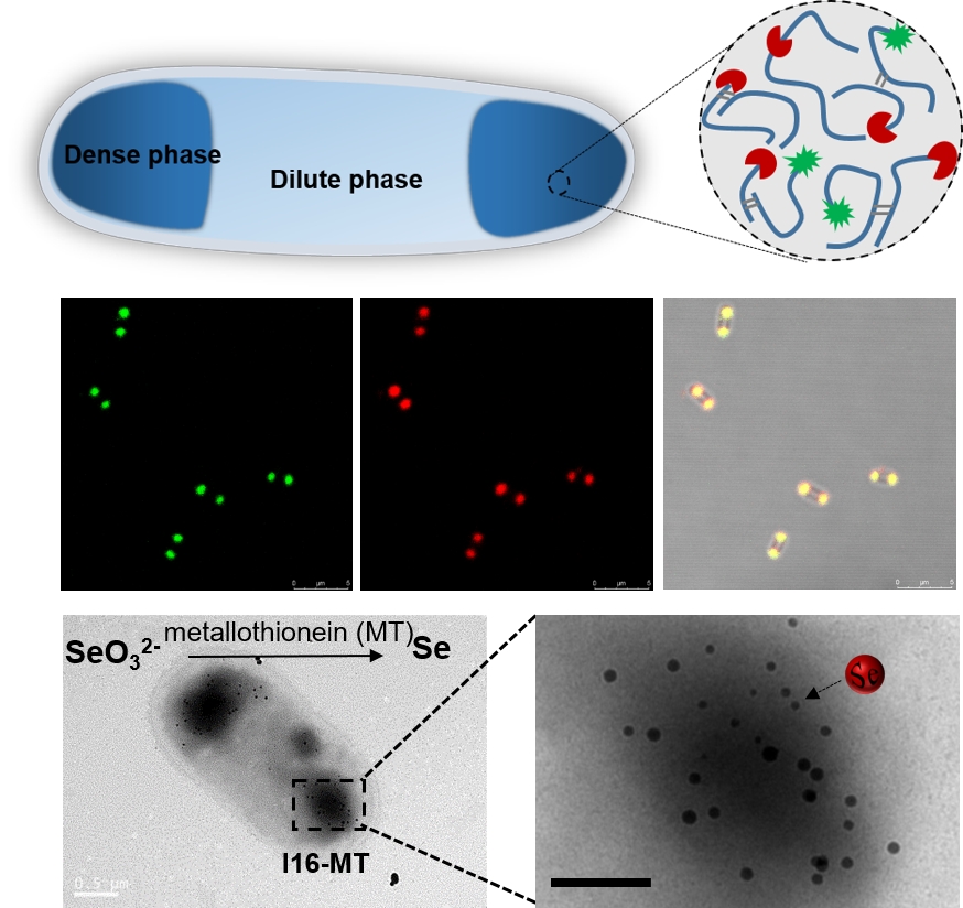 生命体进化经历了从无到有、从简单到复杂的过程。在复杂的真核细胞内,存在经典的有膜细胞器和没有脂膜包被的无膜细胞器。这类近年才备受关注的无膜细胞器,广泛分布于细胞核、细胞质甚至细胞膜上,形成类似于胞内“小液滴”的特殊微环境,通过富集蛋白质、核酸等大分子参与代谢等重要的生理和病理过程。在尚未进化出有膜细胞器的原核细胞中,是否存在无膜的亚细胞结构,启发生物学家的深入思考和长期探索。该团队长期研究蛋白质材料的设计及微生物合成,仿生合成的蛛丝蛋白、类节肢弹性蛋白,因为含有高度重复的固有无序结构域,与真核生物中的无膜细胞器蛋白组分极为类似。受此启发,该团队首先考察上述材料蛋白在原核细胞中的定位,发现经荧光标记的目标蛋白在模式细胞大肠杆菌的两极形成聚集体(见图1),与基本不可溶、无活性的包涵体迥然不同,而且未进行标记的材料蛋白本身也拥有类似的区室化行为。该团队通过体外重构模拟胞内微环境,揭示了材料蛋白液-液相分离形成亚细胞区室的分子机制。在此基础上,研究中将金属硫蛋白等具有催化功能的酶分子与材料蛋白融合,通过单个或多个融合蛋白的胞内区室化共定位,实现了预期的人工无膜区室功能化,展现了原核细胞内生物合成时空可控的可行性和优越性。