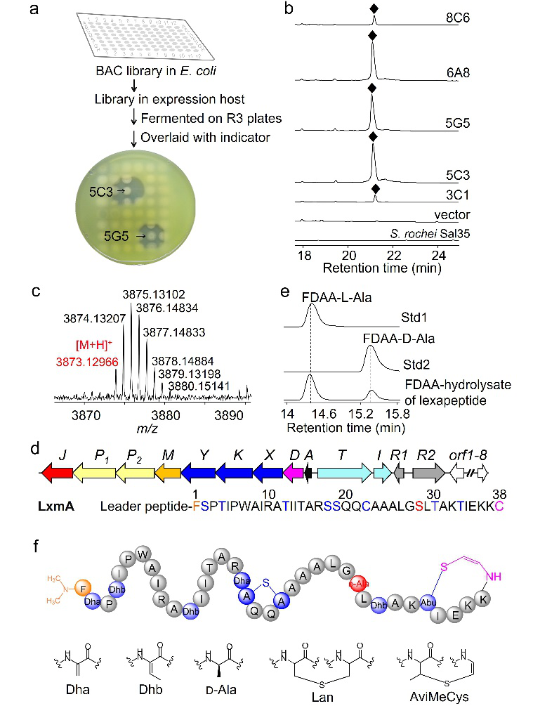 a. 通过LEXAS筛选从娄彻氏链霉菌Sal35的基因组BAC文库中鉴定出具有抗菌活性、生产雷可肽的克隆。b. HPLC分析携带雷可肽生物合成基因簇的5个BAC克隆的异源表达产物(雷可肽峰用黑色菱形突出显示,230 nm)。野生型菌株娄彻氏链霉菌并不产生雷可肽。 c. 雷可肽的HRMALDI-FTICR质谱。 d. 雷可肽的生物合成基因簇和前体肽(LxmA)中的核心肽序列。 e. 雷可肽中D-Ala和L-Ala的手性分析。 f. 本文确定的雷可肽结构。