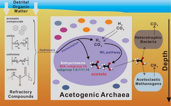 王风平教授领导的地微生物学研究小组长期致力于古菌的生物地质学和地球化学功能研究,综合利用分子生态,环境组学和地质/地球化学技术开展深部生物圈未培养古菌的研究。继发现“深古菌”含有光合作用相关基因(ISME J 2009),发现并命名“深古菌”新门(ISME J 2014)等研究成果的基础上,近期研究团队与深圳高等研究院的李猛教授和美国伍兹霍尔海洋研究所的Stefan M Sievert教授合作,成功解析了“深古菌”部分类群的独特代谢形式。研究发现其同时具有降解难降解有机化合物例如芳香烃化合物,几丁质,纤维素等的代谢途径和利用无机碳自养合成乙酸的途径,提出“深古菌”是海洋沉积物中碳循环和生态系统的核心驱动者(图1)。这是首次发现和通过酶学功能检测证实古菌具有自养产乙酸的代谢方式,极大地拓展了对古菌代谢多样性的认识,促使研究者们重新思考和理解古菌在深部生物圈的生态地位和功能,同时也为认识早期生命的起源打开了一扇新的窗户。
