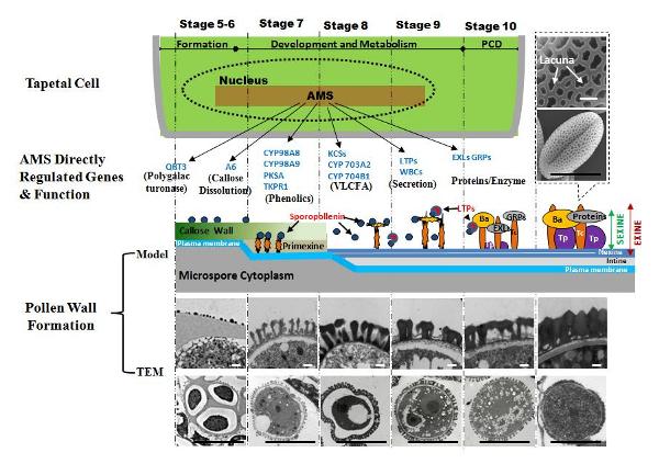 张大兵教授研究团队在已有研究工作基础上(zhang et al., Plant cell, 2006; xu et al., Plant cell, 2010),通过对拟南芥花粉外壁形成过程进行深入研究和分析,重新发现和认识关键转录因子ABORTED MICROSPORES(AMS)的功能,通过遗传学、生物化学、细胞生物学等手段,证明AMS可以通过调控至少23个基因的时空表达,来实现对胼胝质及初生外壁的合成、孢粉素合成、运输和沉积等一系列重要生命过程的精确控制,从而控制花粉壁的形成。