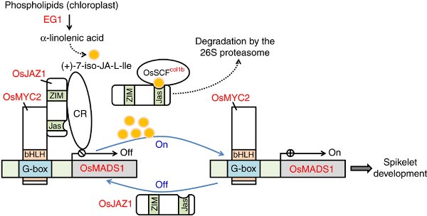 该项工作发现水稻EG1编码茉莉素合成关键酶,EG2/OsJAZ1编码茉莉素信号途径中的抑制因子;依赖于EG1合成的茉莉素信号可以促进水稻花器官的发育,茉莉素受体OsCOI1b在感应到茉莉素信号后,与信号抑制因子EG2/OsJAZ1结合,并将其带到26S蛋白降解复合体中进行降解反应,从而释放茉莉素响应基因OsMYC2,OsMYC2蛋白可直接结合到E类花器官发育调控基因OsMADS1的启动子区域,激活水稻小花的发育进程。该项研究首次证明了植物激素茉莉酸信号途径可调控水稻花器官发育,为阐明水稻花器官发育的分子机理提供了新的机制。