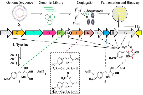 在本研究中,由德林研究小组经过十余年的努力,利用生物活性为导向的高通量筛选技术,首次在刺孢吸水链霉菌北京变种中克隆到了茴香霉素的生物合成基因。通过体内遗传结合体外生化研究,研究人员发现了一个新颖的吡咯烷生物合成基因集成负责茴香霉素的生物合成。鉴定该基因集成编码4个核心酶,氨基转移酶AniQ催化两步转氨反应,转酮酶AniP催化4-羟基苯丙酮酸和3-磷酸甘油醛的缩合,糖基转移酶AniO催化隐藏的糖基化反应,兼具氧化和还原双功能的脱氢酶AniN介导的吡咯烷的形成。其中,隐藏的糖基化反应是在天然产物生物合成中首次发现,极大地拓展了人们对于天然产物生物合成中糖基化反应的理解和认识。相关茴香霉素生物合成的系统基础研究,将有力推动该农用抗生素的品种创新和品质改造。