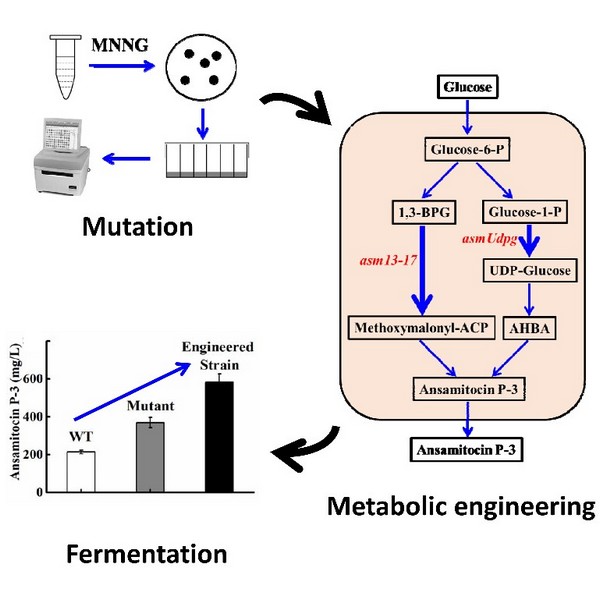 该研究结合传统诱变方法和代谢工程改造提高抗癌药物安丝菌素P-3发酵产量,由博士研究生杜志强、硕士研究生张源为共同第一作者,参与完成者包括团队年轻教师钱志刚、肖晗等。课题组首先从观察到安莎类物质在254nm存在特征吸收峰为基础,设计了高通量筛选方法,从近500株突变株中筛选到一株AP-3高产突变株;紧接着针对该突变株,运用代谢工程手段对AP-3生物合成途径起始单位3-氨基-5-羟基-苯甲酸(AHBA)途径以及甲氧基丙二酰ACP途径进行理性的遗传改造,有效增强了这两个前体途径的供应,最终使AP-3产量达到600 mg/L左右,比至今国内外报道的最高产素水平(美国专利)还要高50%。该研究进一步从基因转录水平和中间代谢物胞内浓度等揭示了产量提升的理论基础,也获得了一些今后可望提高AP-3产量的信息。研究成果将直接有助于降低AP-3的生产成本、促进其商业应用。