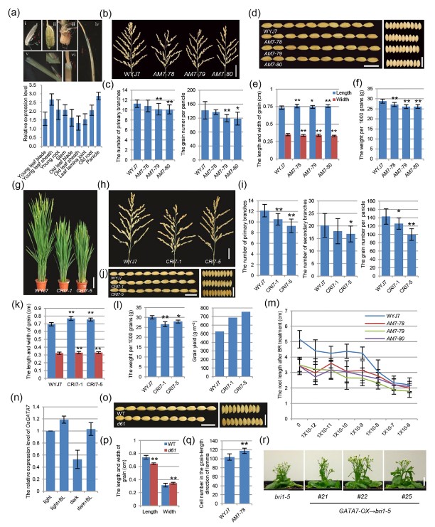 本研究鉴定了一个新的水稻GATA类转录因子OsGATA7,该基因受BR调控,同时其表达和功能改变又能影响植株的BR信号和BR响应。该基因低表达和基因组编辑(CRISPR-CAS)的水稻植株矮杆、叶片直立,穗粒数与千粒重略有下降,与BR缺失或不敏感的弱突变体相似,但是粒形狭长。在拟南芥BR不敏感弱突变体bri1-5中过量表达该基因能够回复突变体的部分表型,说明该基因参与了BR信号对植物生长发育的调控中的部分过程。实验结果还显示,虽然适当降低该基因的功能使水稻单株产量略有下降,但是种植密度的提高有望增加单位面积的总产量。