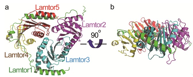 研究人员解析了人源Ragulator五元蛋白质复合物的晶体结构,发现该复合物的Lamtor1亚基像一根皮带一样,把其他四个亚基Lamtor2、Lamtor3、Lamtor4、Lamtor5裹在一起。揭示了Lamtor4和Lamtor5缺乏alpha3螺旋结构,通过Lamtor1的两段螺旋嵌在Lamtor4和Lamtor5上对应于Lamtor2和Lamtor3的alpha3螺旋的位置,从而稳定了Lamtor2和Lamtor3的结构。研究还发现,酵母的Ego复合物仅对应于Ragulator的三个亚基(Lamtor1的C端、Lamtor2和Lamtor5),可能存在尚未发现的其他亚基。