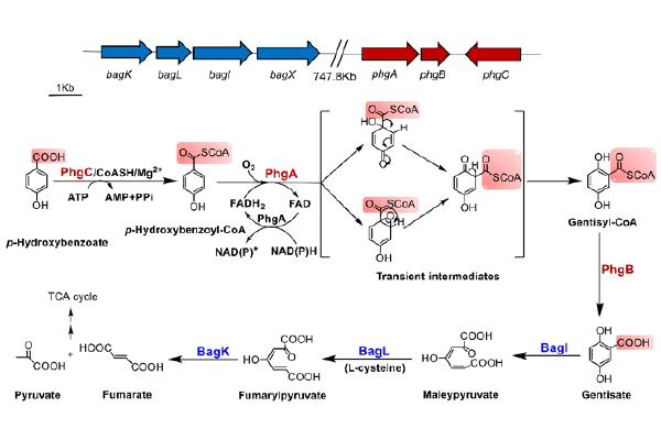 为揭示羧基迁移的分子机理,周宁一团队在PHB利用菌Brevibacillus laterosporus PHB-7a 中发现了负责将PHB转化为GA的基因簇(phgABC)以及代谢GA至三羧酸循环的下游基因簇(bagILK)。通过稳定同位素实验证明了PHB转化为GA的过程中,羧基发生了分子内的迁移和保留。研究组进一步对 PhgABC 的三个蛋白分别进行功能验证和中间代谢产物分析发现,羧基的分子内迁移是经由CoA硫酯化合物的形成、苯环羟基化和硫酯键的水解这三步完成的,从而从酶学水平详细阐明了羧基分子内迁移的本质是p-hydroxybenzoyl-CoA中酰基辅酶A(acyl-CoA thioester)的迁移(图1)。这一羧基分子内迁移模式的发现揭示了硫酯化合物在生物化学过程中新的功能,并体现了微生物分解代谢芳香化合物途径的多样性。