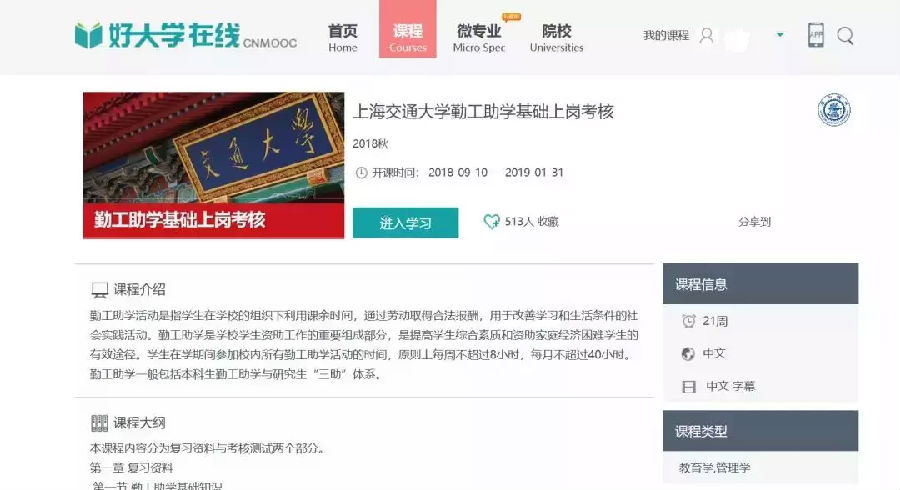 为了提高上海交通大学校内助管的技能,为交大学生提供多样培训课程,同时也为校内用人单位提供更好的助管服务,上海交通大学学生事务中心勤工助学办公室推出了“上海交通大学助管能力提升计划”系列MOOC在线培训课程,为同学们提供不同类型技能的培训。参加的同学不仅可以提升技能,学习课程还能评优哦!课程见下列链接:
