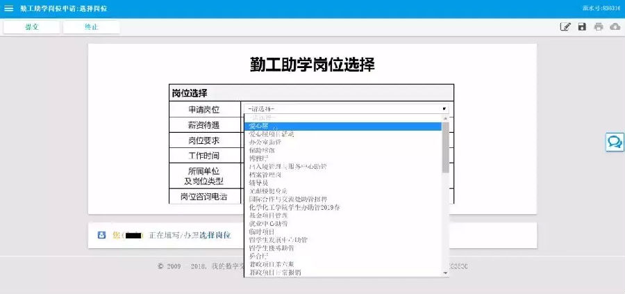 在新的界面中,点击“学生工作”,选择“勤工助学岗位申请”,即可申请岗位。