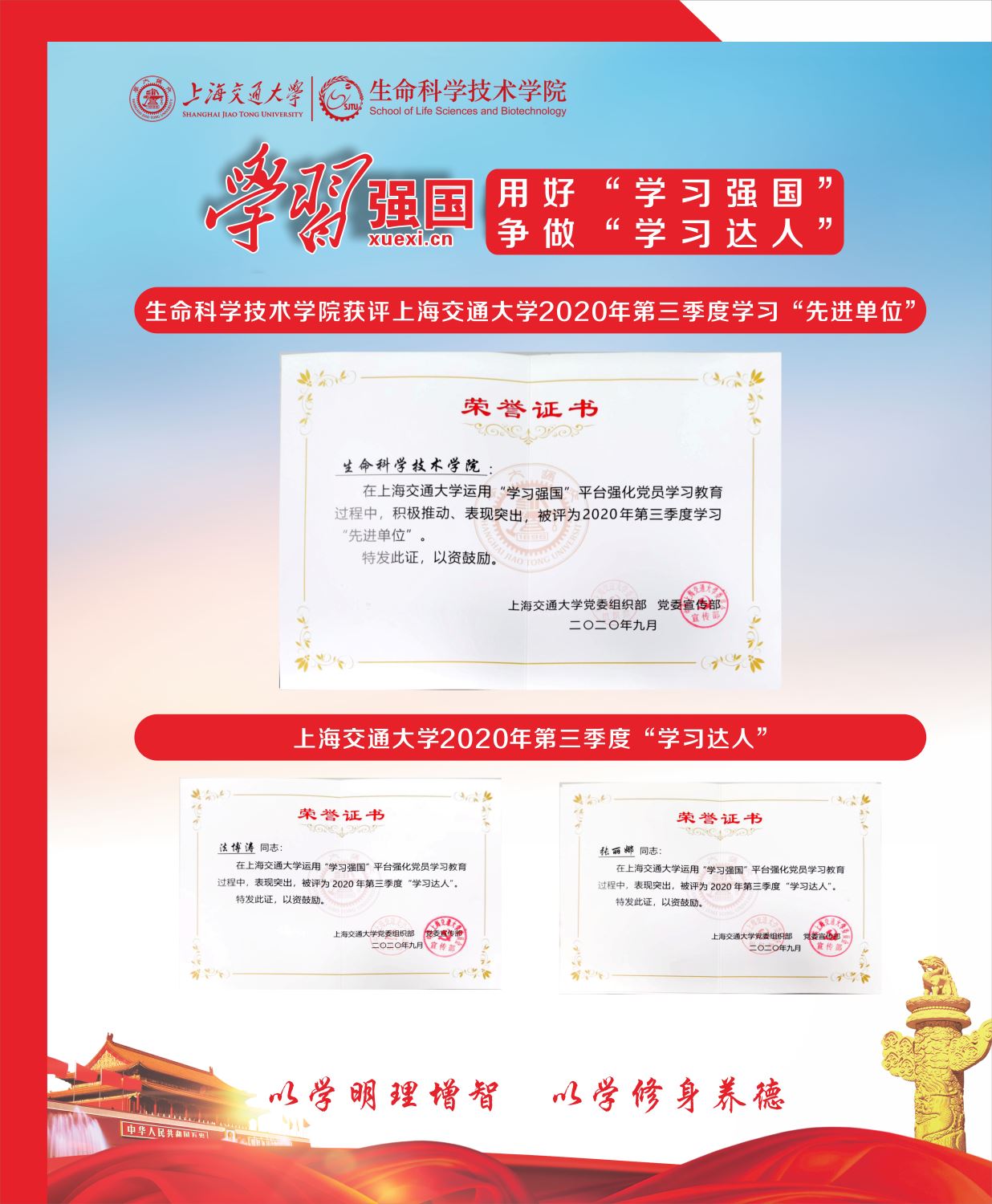 在上海交通大学2020年第三季度“学习强国”学习先进单位评选中,生命科学技术学院再次获评学习“先进单位”荣誉称号。