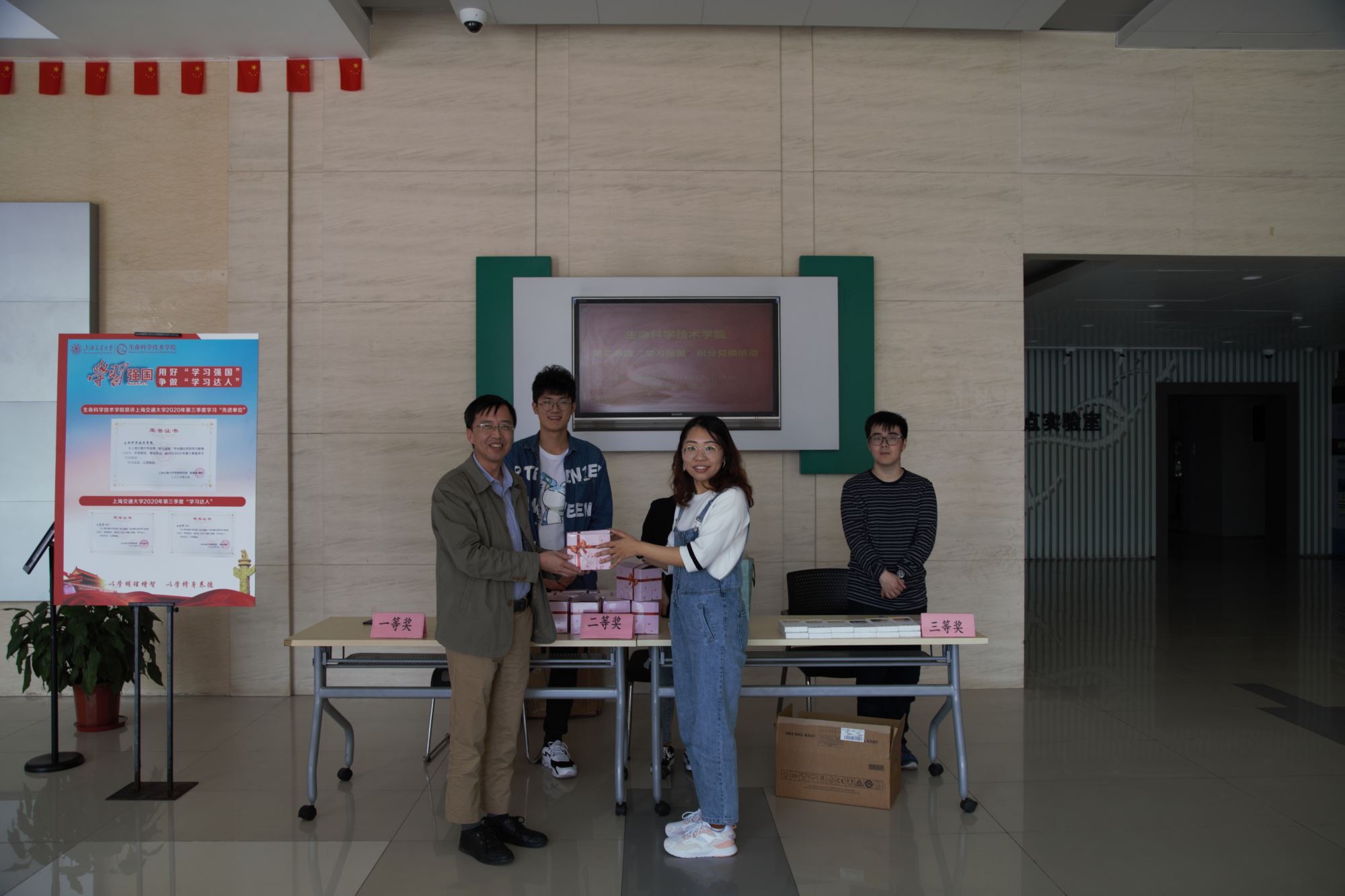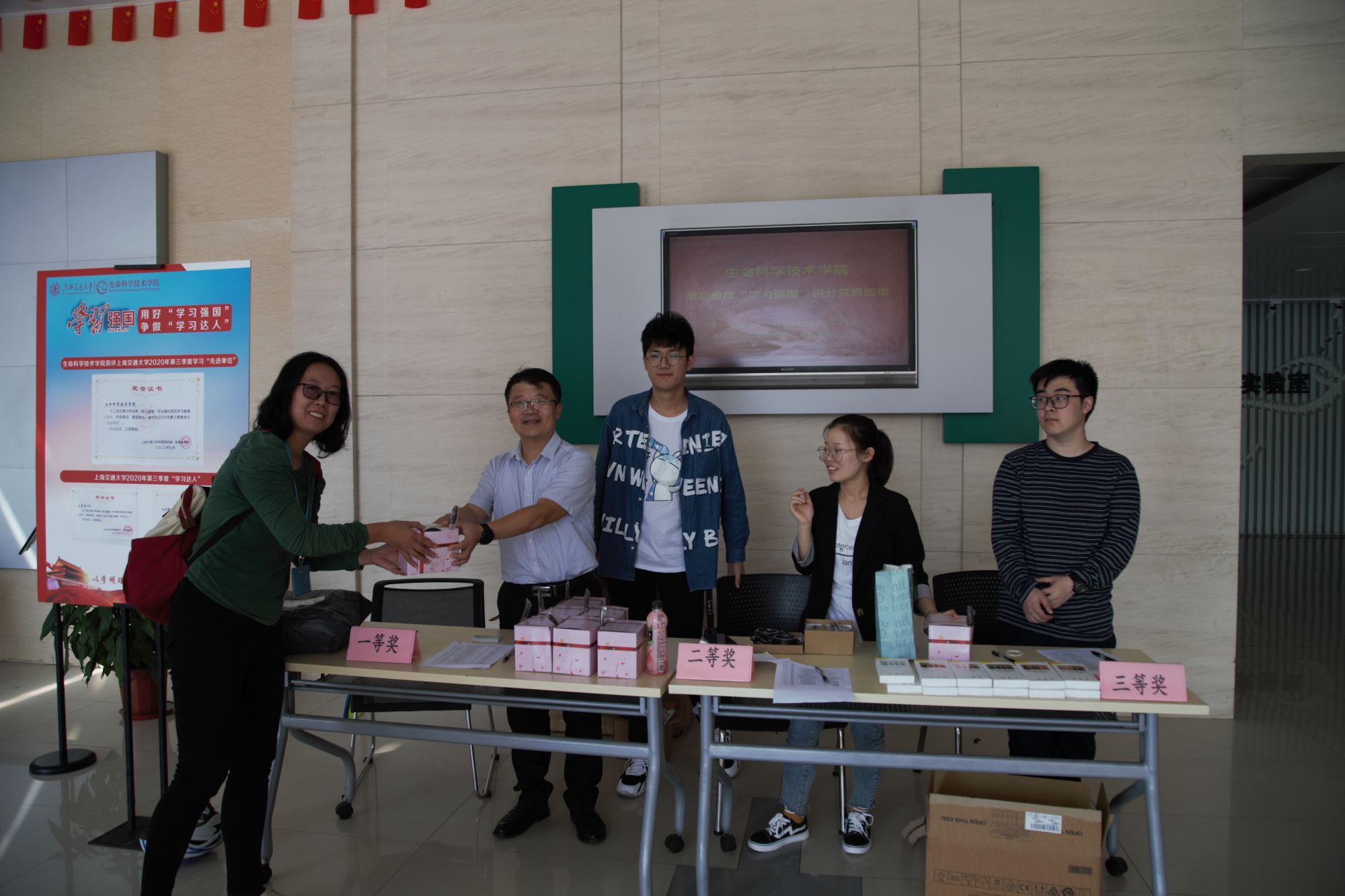 10月13日中午,生命科学技术学院在学院大厅进行了“学习积分”纪念品兑换活动。活动中,学院党委书记嵇绍岭、党委副书记李文纯、副院长张晓君也来到现场,为师生颁发纪念品,并充分肯定了大家的学习热情,鼓励广大师生继续利用好“学习强国”平台,不断提升自身理论知识水平。学院师生经过一个季度的认真学习后,根据自身积分领取到了精美而实用的纪念品。