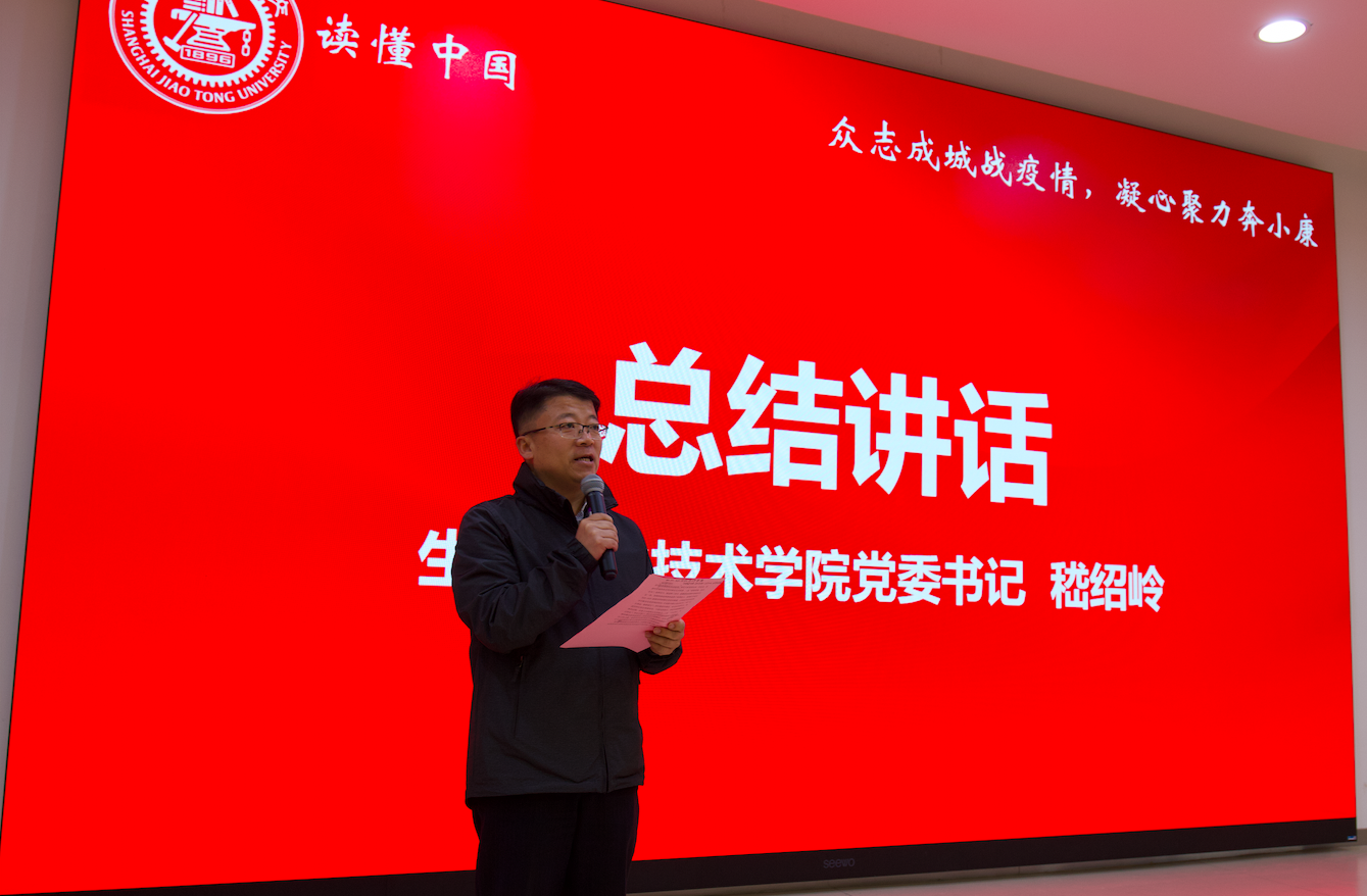 嵇绍岭总结讲话。他指出今天的抗疫成果来之不易,能够顺利复工、复产、复学,要感谢疫情下千千万万像陈巍医生一样的医务工作者坚守岗位、舍身忘我奋斗在抗疫一线,同时也极大地体现了中国共产党领导下的中国特色社会主义制度优势,彰显了我们大国的责任和担当。习近平总书记在全国抗击新冠肺炎疫情表彰大会上的讲话中提到,“中国的抗疫斗争,充分展现了中国精神、中国力量、中国担当”,“参加抗疫的医务人员中有近一半是‘90后’、‘00后’,他们有一句话感动了中国:2003年非典的时候你们保护了我们,今天轮到我们来保护你们了”。嵇绍岭书记引用习近平总书记的讲话来勉励青年学子向党员模范学习,并向同学们寄语了几点希望,一是“爱国爱党,担当作为”,选择交大,就选择了责任,希望同学们在实践中践行责任担当;二是“立志高远,砥砺前行”,希望同学们坚定理想信念,不畏风雨前行,享受为理想搏击沧海的过程,在奋斗中找到人生的意义;三是“不忘初心,牢记使命”,学科在路上,每位同学都是中国事业发展的推动者和助跑者,在这次新冠疫情中,生科人、航天人也贡献了自己的力量。希望同学们以社会主义建设者和接班人为使命,让中华民族伟大复兴在新青年的奋斗中梦想成真。