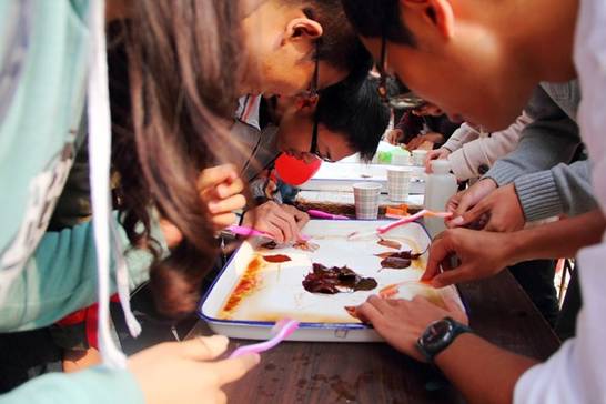 在另外一个展台上,围满了制作叶脉书签的同学,在生命科学技术学院工作人员的引导下,在场的同学踊跃报名,跃跃欲试。他们兴致盎然而又小心翼翼地用刷子刷着叶片,就怕一不小心毁坏了自己的作品。在工作人员的指导下,很多同学都亲手制作了叶脉书签,他们表示,这是他们第一次动手制作书签,收获很多,也很有乐趣。叶脉书签趣味实验充分展现了生物学实验的趣味性,展现了我院独特风采。