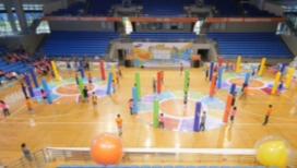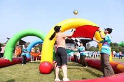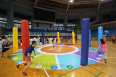 每队6名队员。2人分别站在起点和终点,剩余4人两两一组站在指定区域,比赛限时3分钟。比赛开始后,起点队员将球放在第一组队员的布垫上,第一组队员协力用布垫将球抛起越过障碍柱到下一个格子,站在第二个格子的2名队员用手中的布垫将球接住后,同样用布垫将球抛给终点队员,终点队员将球放入筐内,即为成功一次(球未进筐不算)。3分钟时间内,以成功次数计算比赛成绩,如球全部进筐,则按用时数排序积分。