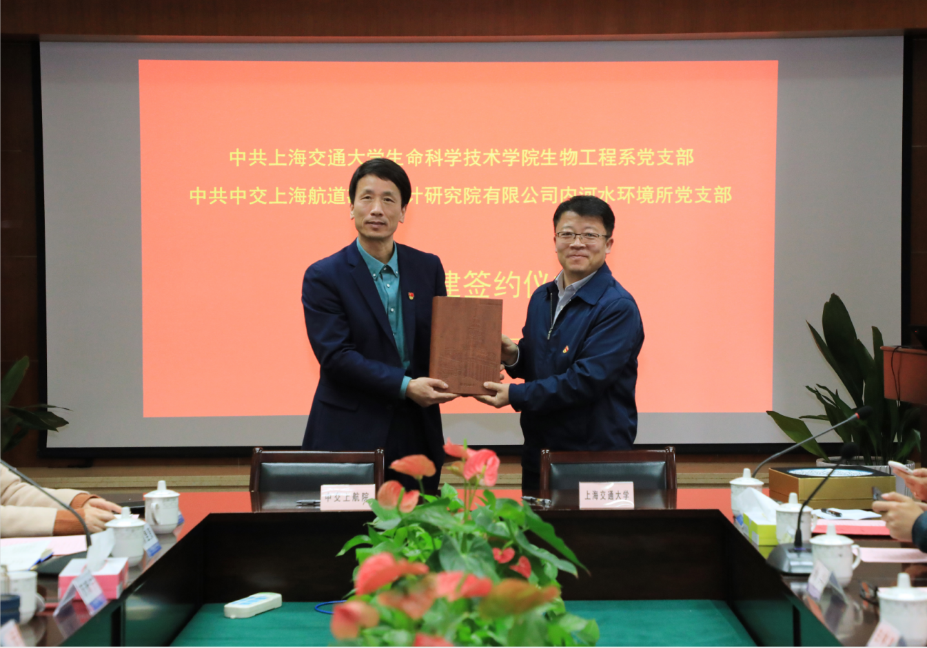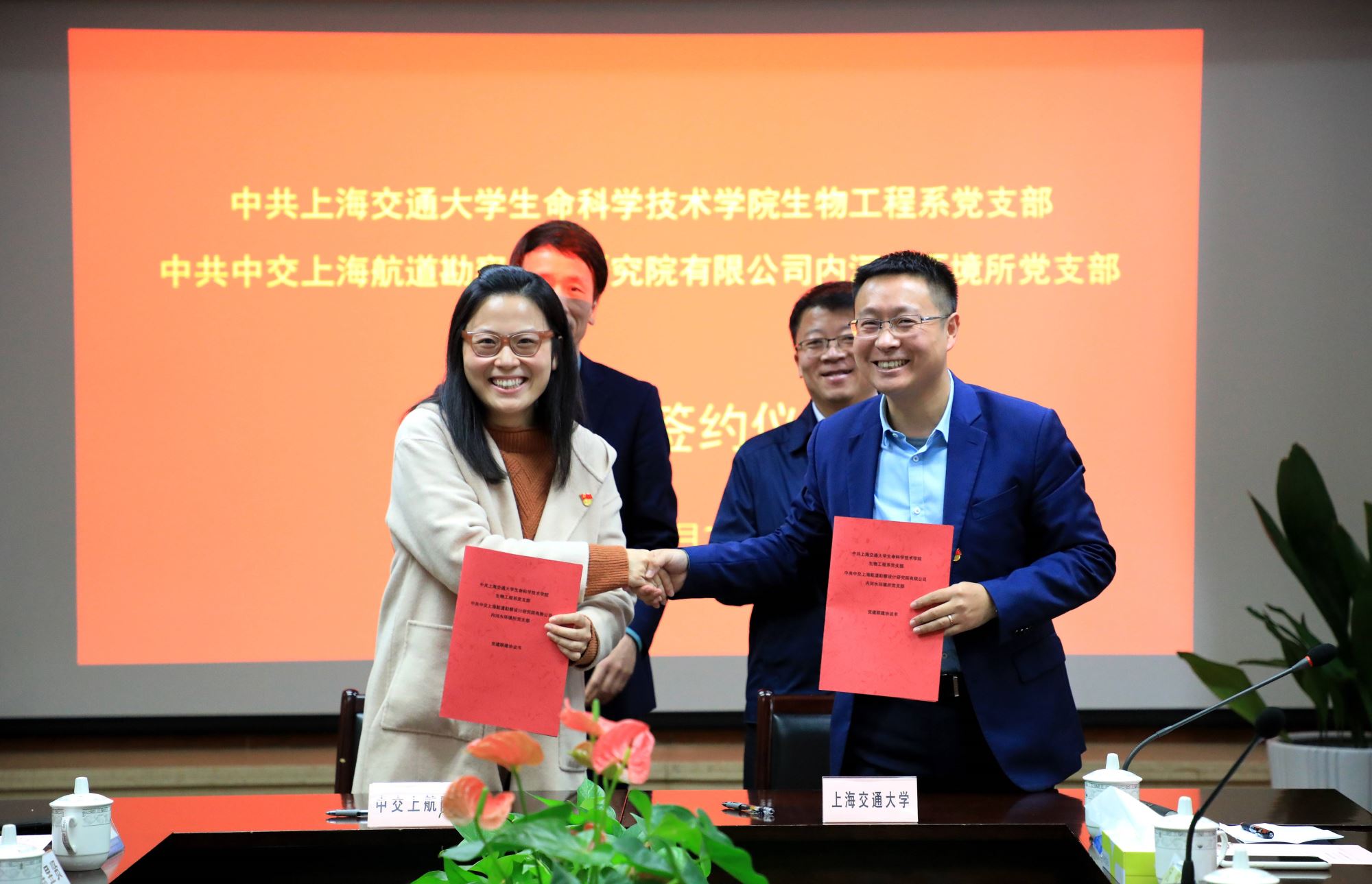 首先,上航院内河水环境所党支部书记黄荳荳介绍了该党支部的概况和党建工作情况,生物工程系教工党支部书记唐鸿志介绍了支部的党建工作情况,希望通过交流增进双方的相互了解,碰撞出思想的火花,为科技成果的转化打通最后一公里。然后,在生命科学技术学院嵇绍岭书记和上航院张群书记的见证下,双方举行了两个党支部党建联建的签约仪式。