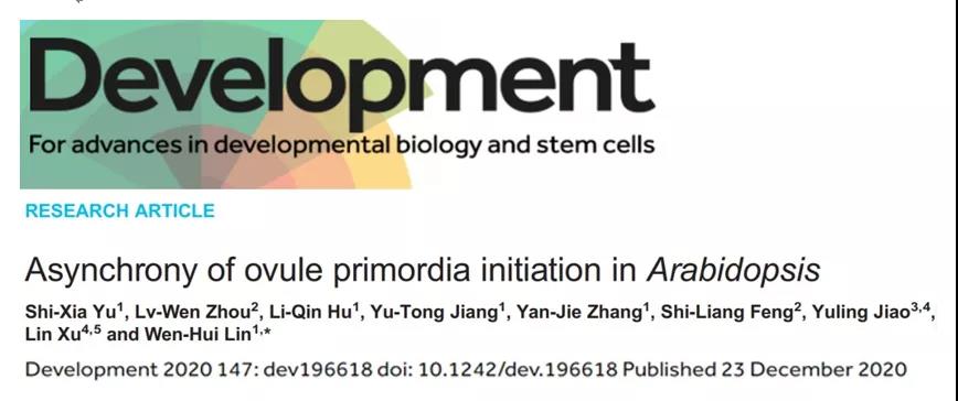 近日,上海交通大学生命科学技术学院林文慧研究团队在著名学术期刊Development在线发表了题为Asynchrony of Ovule Primordia Initiation in Arabidopsis的研究论文,详细阐述了胚珠发生的过程及其调控机制。上海交通大学生命科学技术学院博士生于世霞为该论文的第一作者,生命科学技术学院研究员林文慧为通讯作者。宁波大学周吕文博士和冯世亮博士、中国科学院遗传与发育研究所焦雨铃研究员、以及中国科学院分子植物科学卓越创新中心徐麟研究员参与了该项工作。
